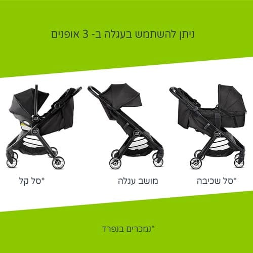 - ניתן להשתמש בתוספת סל קל/סל שכיבה (הנמכרים בנפרד) – העגלה עוצבה מחדש עם חיבור לסל קל ומרכב שכיבה (באמצעות מתאמים) המותאמים מגיל לידה, כך שתוכלו לטייל עם ילדכם (מתאמים לסל השכיבה מגיעים יחד עם הסל שכיבה. מתאמים לסל קל נמכרים כמוצר נפרד)